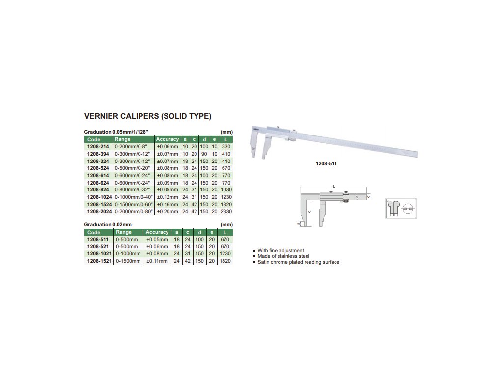 Pevné posuvné meradlo s nóniom a s jemným stavaním značky INSIZE má rozsah merania 0-2000 mm/0-80" a číslicový krok 0,05 mm/1/128".