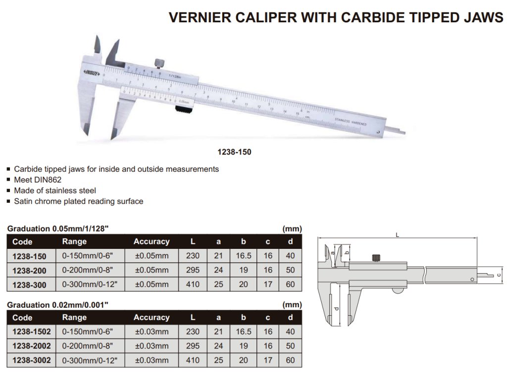 Posuvné meradlo značky INSIZE s dotykmi z tvrdokovu, rozsahom merania 0-200 mm/0-8 ", delením 0.02/0,001".