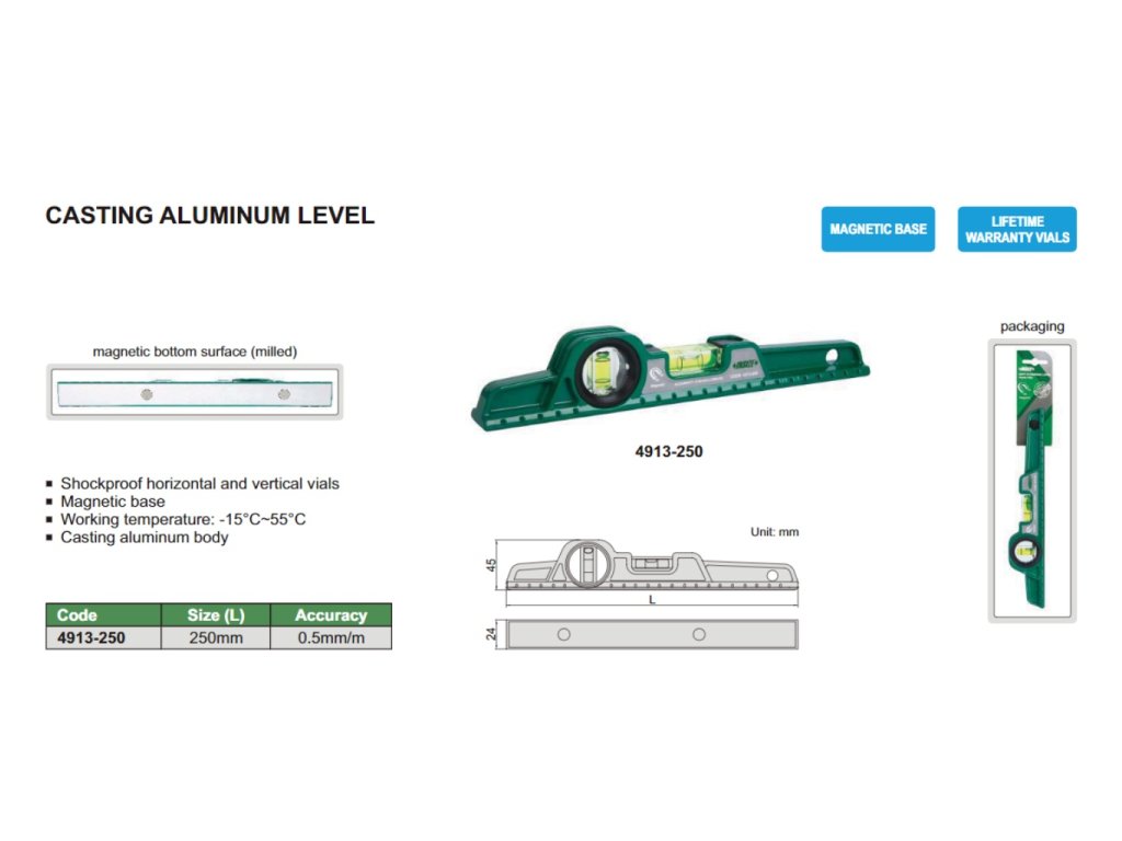 Hliníková vodováha značky INSIZE s veľkosťou 250 mm, s presnosťou merania 0,5mm/m a odolnosťou voči nárazu.