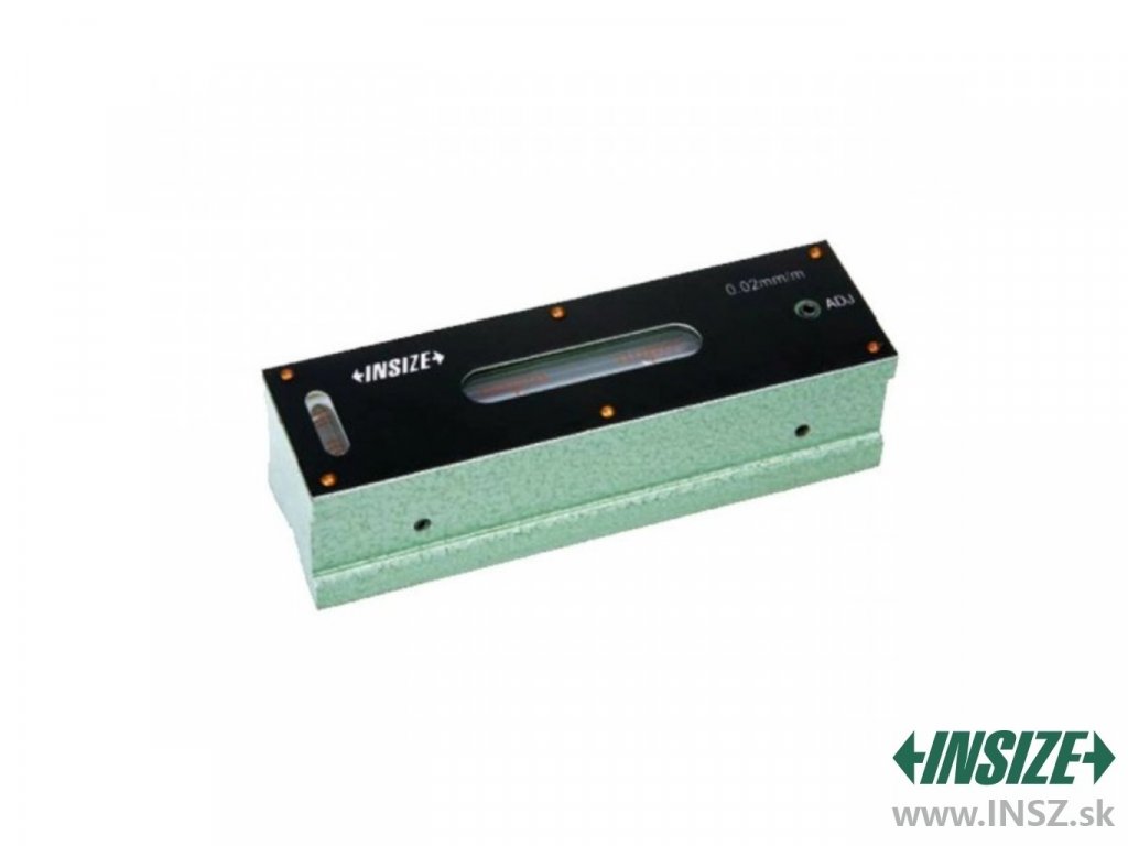 Strojná vodováha značky INSIZE s dĺžkou 150 mm a s delením 0,05mm/m. V-drážka v spodnej časti meradla.