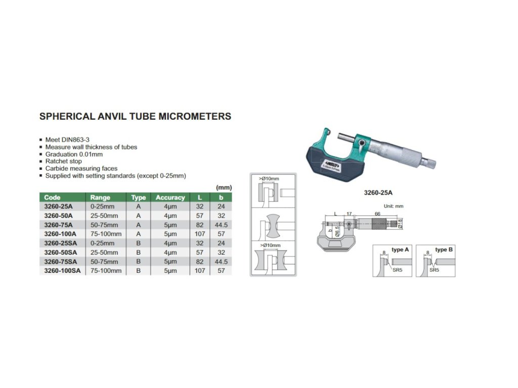 Strmeňový mikrometer na rúrky s guľovými meracími plochami 75-100/0,01 mm, typ B INSIZE