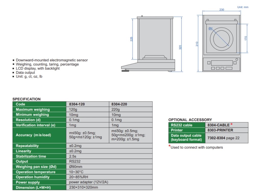 Delenie: 0,1 mg, Maximálna váživosť: 220 g, Minimálna váživosť: 10 mg